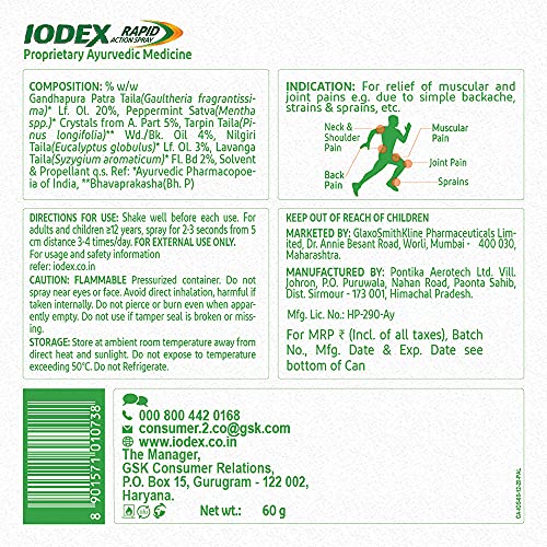 Iodex Rapid Action Spray contains – Gandapuro Tel, Nilgiri Tel, Turpine Ka Tel, Peppermint Satva and Lavanga Ka Tel.